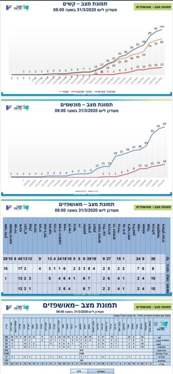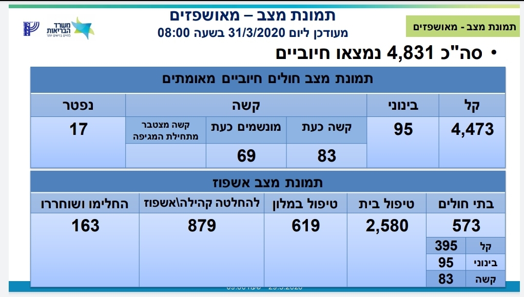 ממשרד הבריאות נמסר כי מניין הנדבקים בנגיף הקורונה בישראל עולה הבוקר ועומד על 4,831 חולים, מתוכם 4,473 במצב קל 95 במצב בינוני, ו – 83 במצב קשה שמתוכם 69 מונשמים, מניין הנפטרים עומד על 17 מתים.
