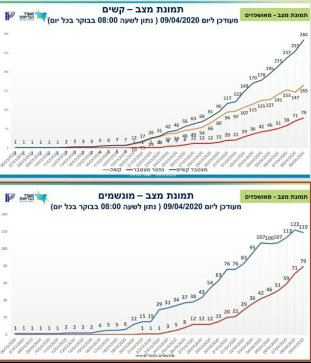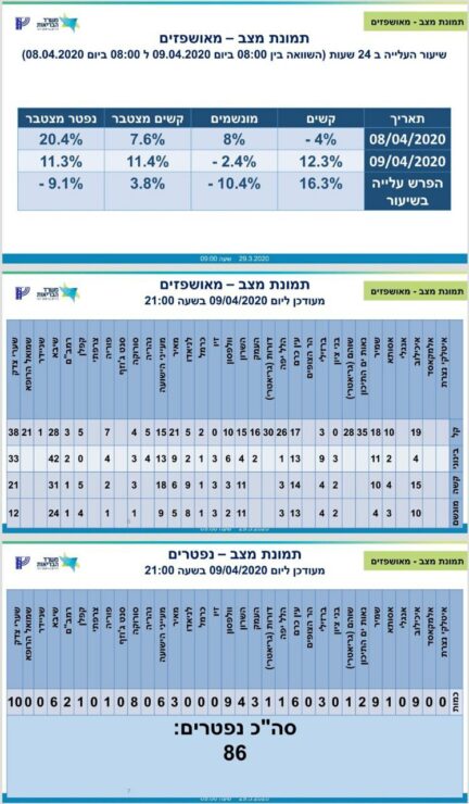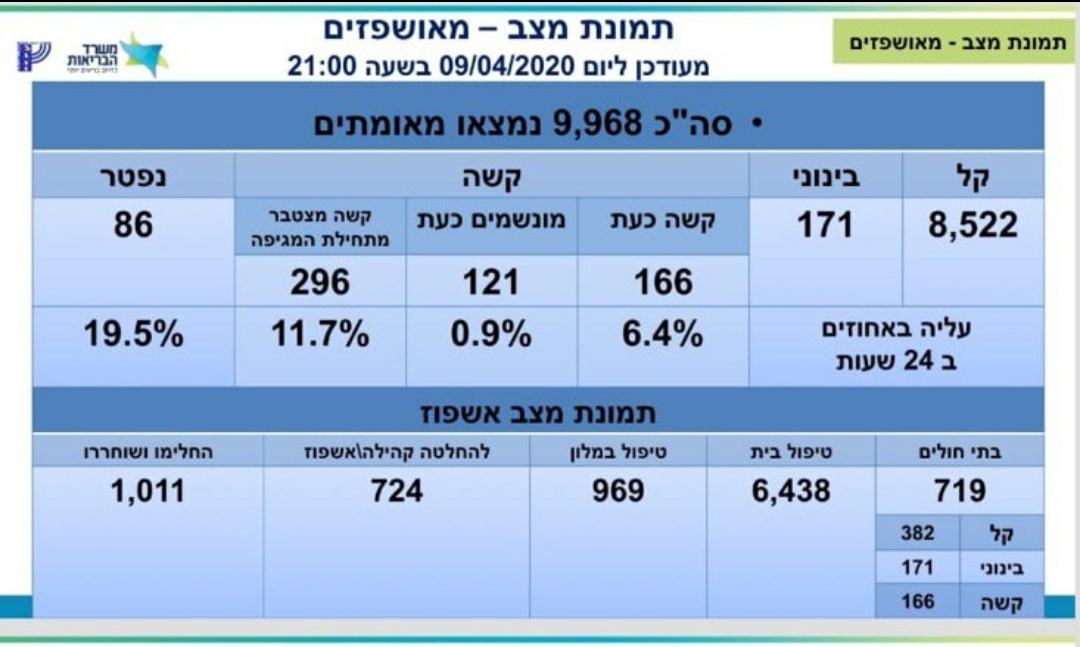 משרד הבריאות מעדכן כי מניין הנדבקים בנגיף הקורונה בישראל עולה הערב ועומד על 9,968 חולים, מתוכם 8,522 במצב קל 171 במצב בינוני, ו – 166 במצב קשה שמתוכם 121 מונשמים. מספר הנפטרים עומד על 86.