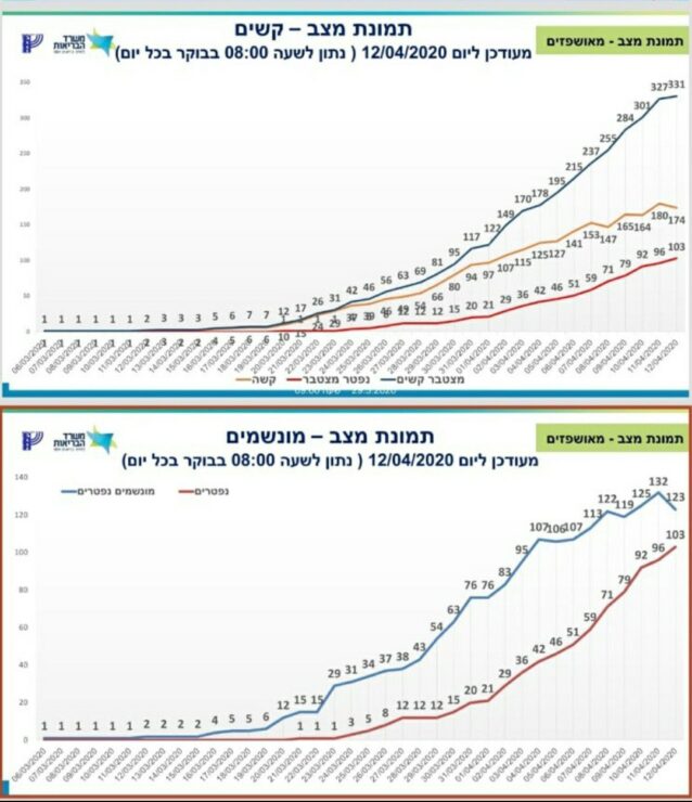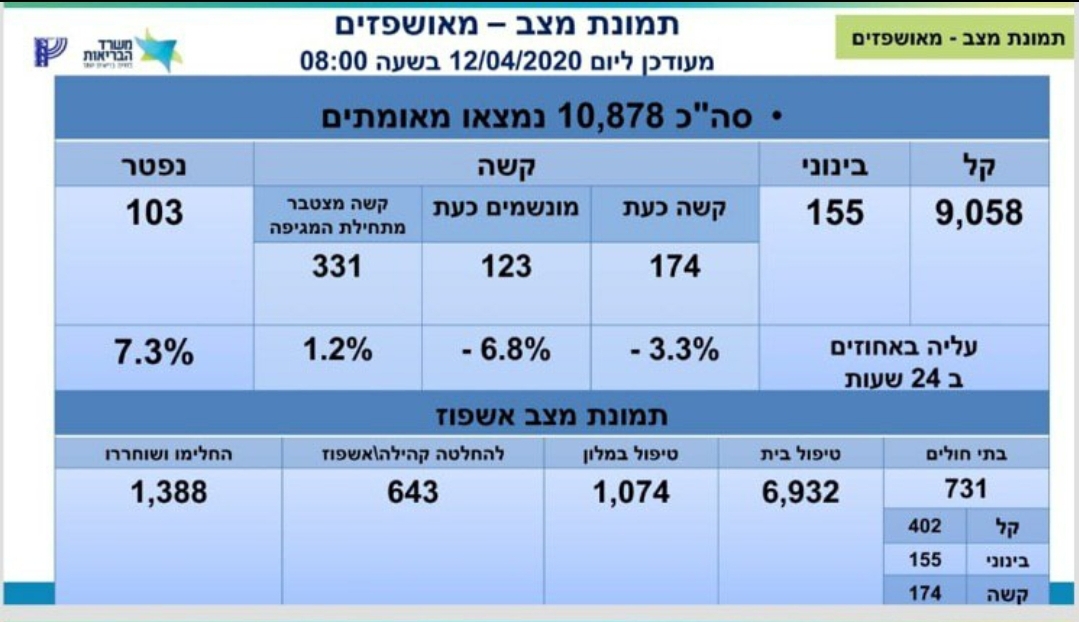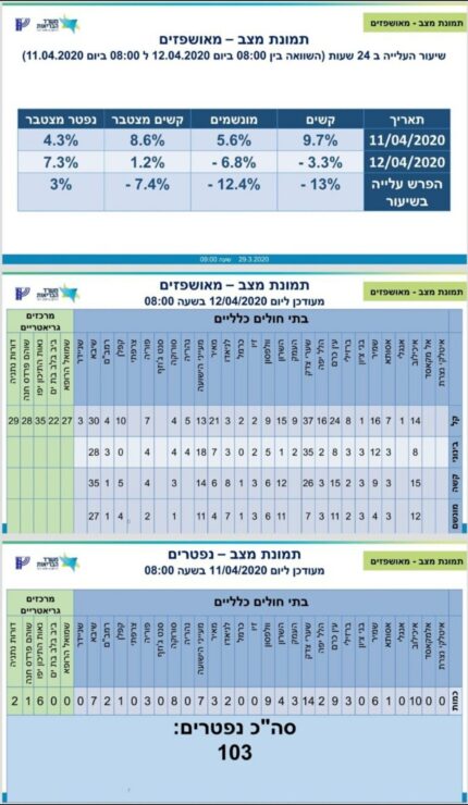 משרד הבריאות מעדכן כי מספר הנפטרים מקורונה עלה ל-103, מספר הנדבקים עומד על 10,878 חולים, מתוכם 9,058 במצב קל, 155 במצב בינוני, ו – 174 במצב קשה שמתוכם 123 מונשמים.