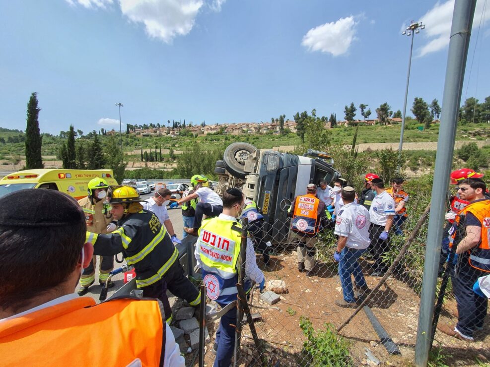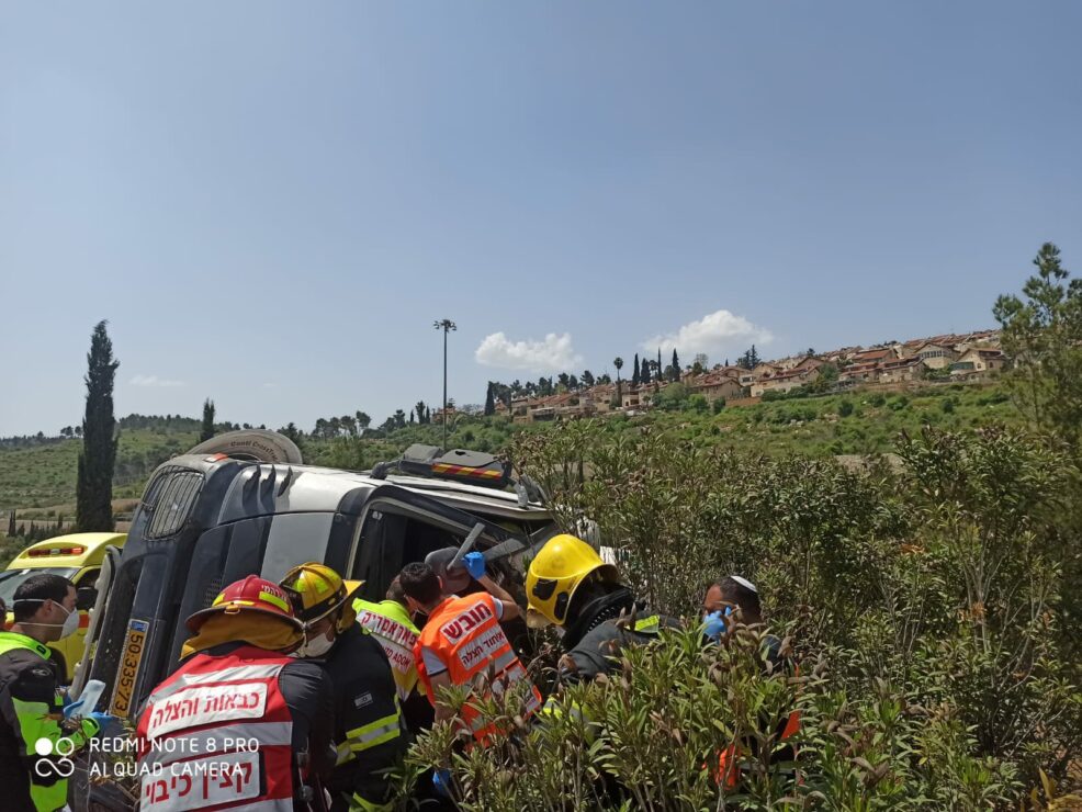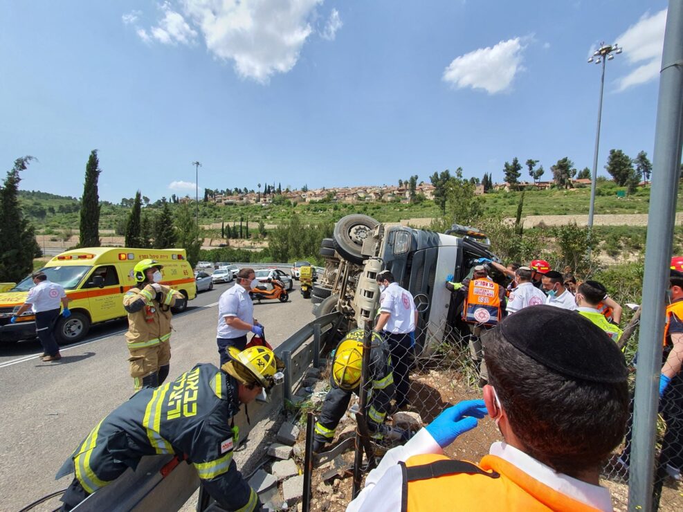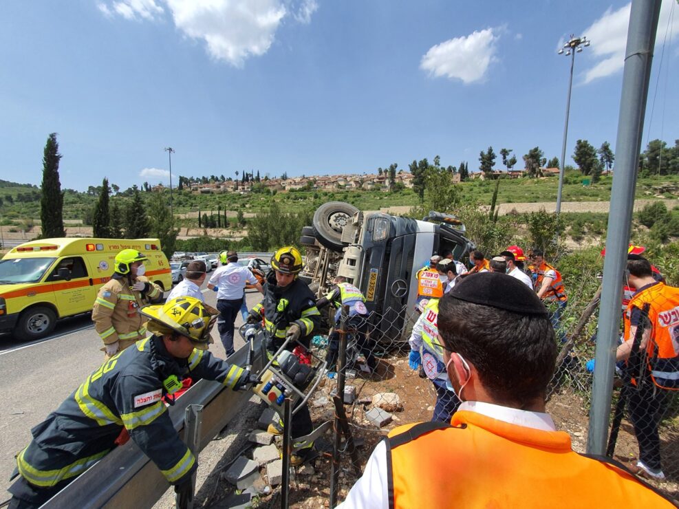 ארבעה צוותי חילוץ והצלה מתחנת ירושלים פעלו לחילוץ נהג משאית שהיה לכוד בתוך המשאית בכביש 9 הר חוצבים.