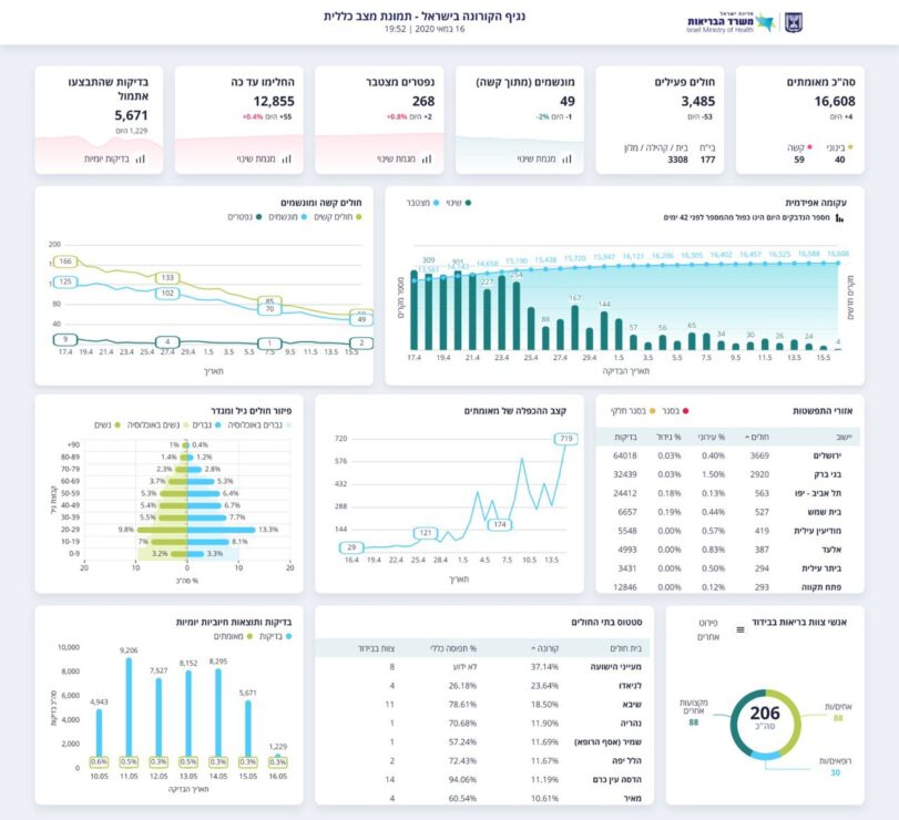 משרד הבריאות מעדכן כי מניין הנפטרים מנגיף הקורונה בישראל עלה ל-268 בני אדם, עד כה נדבקו בנגיף 16,608 בני אדם, בהם 3,485 חולים פעילים ומתוכם 49 מונשמים. מספר המחלימים מקורונה עלה ל-12,855.