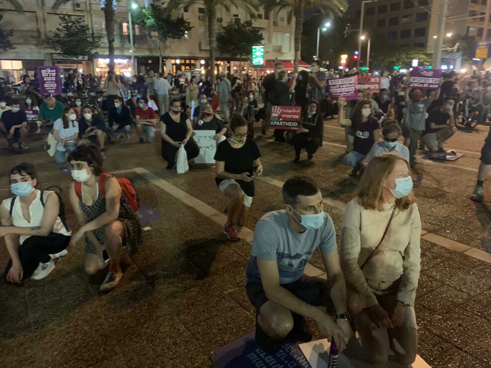 מנכ"לית שלום עכשיו, שקד מורג, כרעה ברך בהפגנה נגד הסיפוח בכיכר רבין בתל אביב, וביקשה מכולם לעשות כמוה, לזכר איאד אלחלאק.