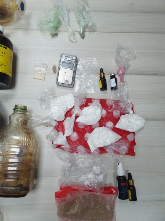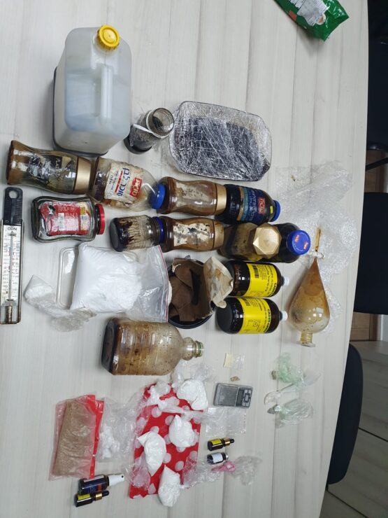 בדירה נתפסו כמויות סמים גדולות ובכלל זה כ – 10 ליטר סם האונס אשר היה מחולק לבקבוקים ומוכן להפצה. בנוסף נמצאו במקום כמויות גדולות של חומרים: אבקה ונוזלים חשודים כסמים ובכלל זה חומר החשוד כסם מסוג דוסה, קוקאין, הרואין ו mdma.