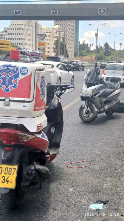 בשעה 12:11 התקבל דיווח במוקד 101 של מד"א במרחב ירקון על רוכב קטנוע שנפגע מרכב בכביש 4 ממחלף גבעת שמואל לדרום. חובשים ופראמדיקים של מד"א ואיחוד הצלה העניקו טיפול רפואי ופינו לבי"ח שיבא בתל השומר גבר כבן 50 במצב בינוני עם חבלת בטן.