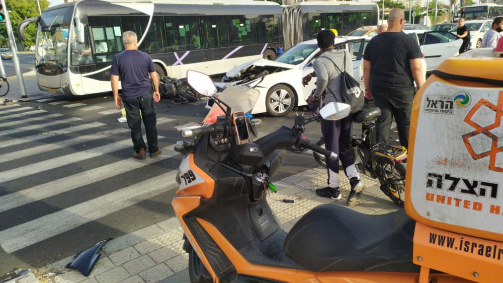 בשעה 19:34 התקבל דיווח על תאונת דרכים בין רוכב אופנוע למונית ברחוב קינג ג'ורג'/ בן צבי בתל אביב יפו. חובשים ופראמדיקים של מד"א ואיחוד הצלה העניקו טיפול רפואי ופינו לבי"ח איכילוב, גבר כבן 30, במצב בינוני,עם חבלות חזה וגפיים.