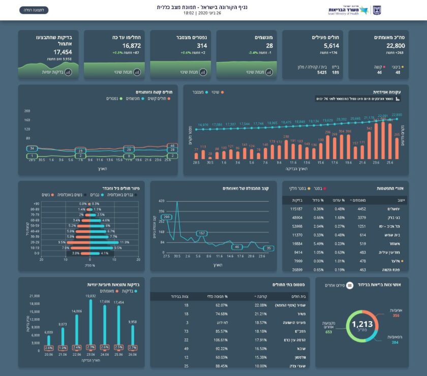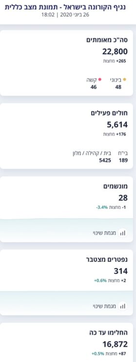 משרד הבריאות מעדכן כי מניין הנדבקים בנגיף הקורונה בישראל עומד על 22,800 חולים, מתוכם 5,614 חולים פעילים כיום, (400 חולים חדשים ביממה האחרונה ו – 265 חולים מחצות) 5,545 במצב קל, 48 במצב בינוני, 46 במצב קשה שמתוכם 28 מונשמים. עד כה 16,872 החלימו.