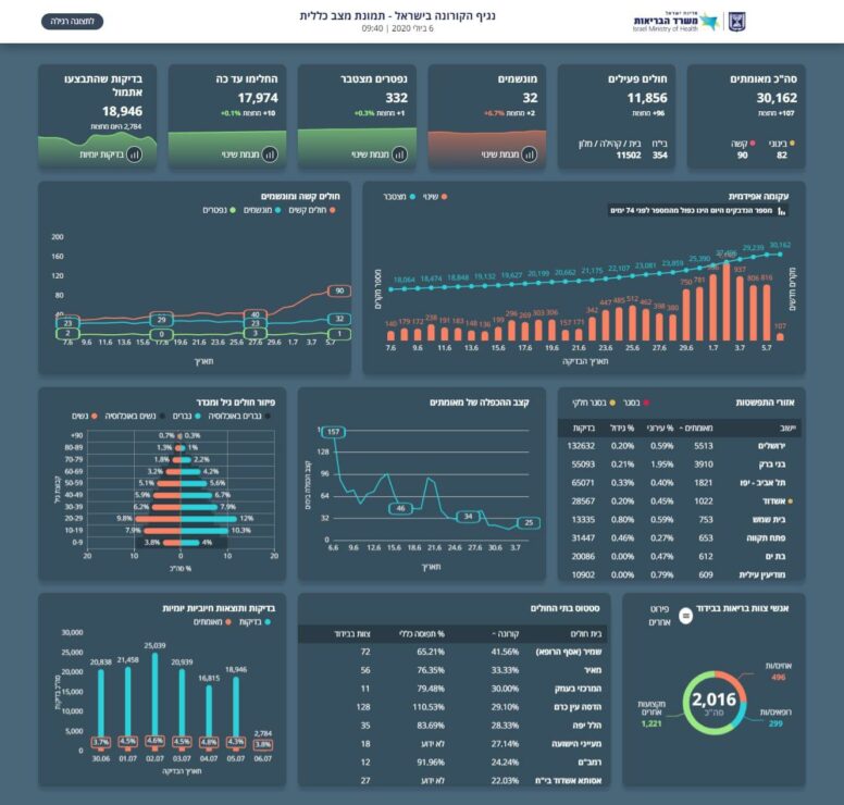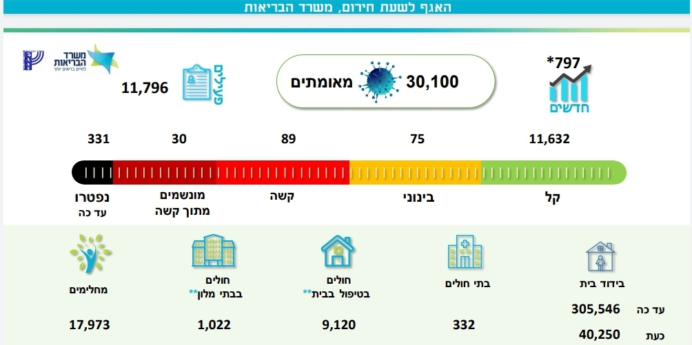 משרד הבריאות מעדכן כי מניין הנדבקים בנגיף הקורונה בישראל עד כה עומד על 30,162 חולים מתוכם 11,856 חולים פעילים כיום, 11,632 במצב קל, 82 במצב בינוני, 90 במצב קשה שמתוכם 32 מונשמים.