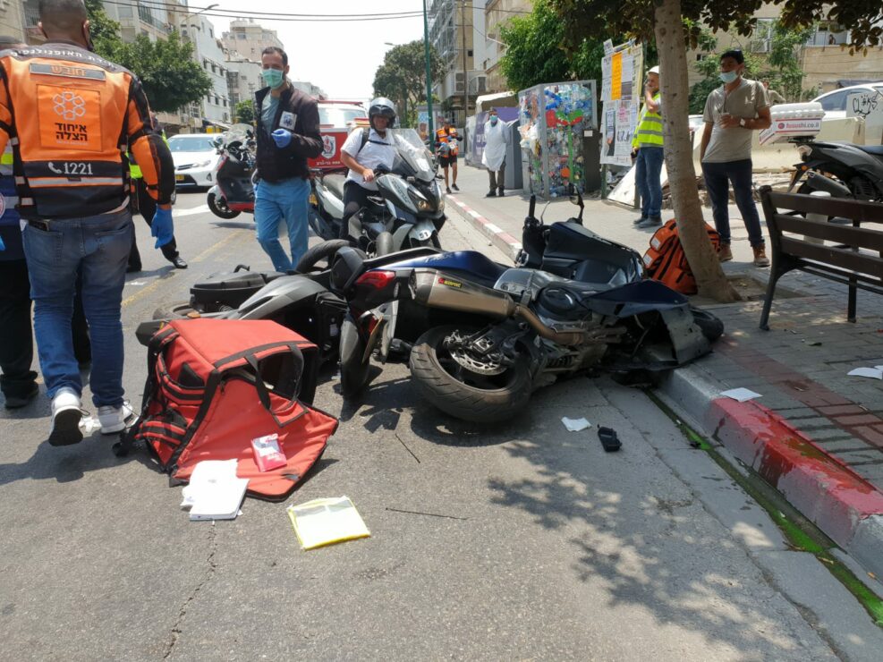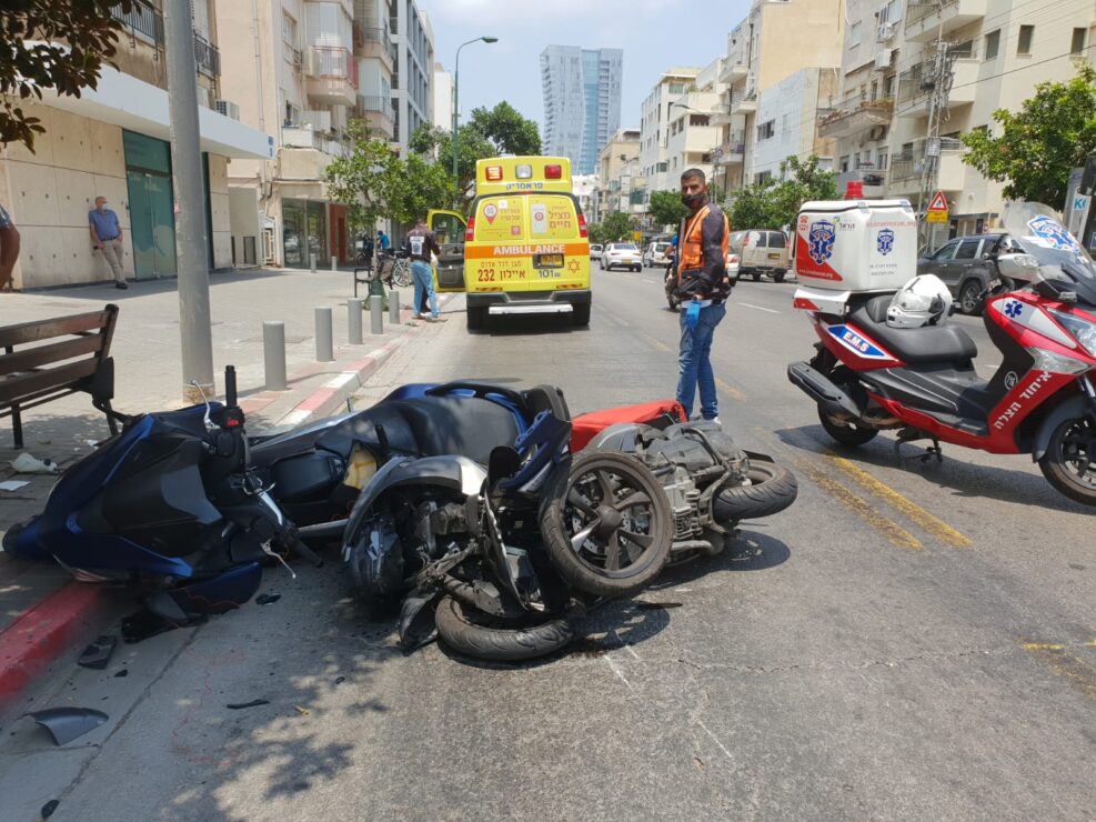 בשעה 12:56 התקבל דיווח על תאונה בין שני אופנועים ברחוב בן יהודה בתל אביב. חובשים ופראמדיקים של מד"א ואיחוד הצלה העניקו טיפול רפואי ופינו לבי"ח איכילוב 2 פצועים במצב בינוני: צעיר כבן 20 עם חבלות בחזה ובבטן וגבר בן 36 עם חבלות באגן ובגפיים.