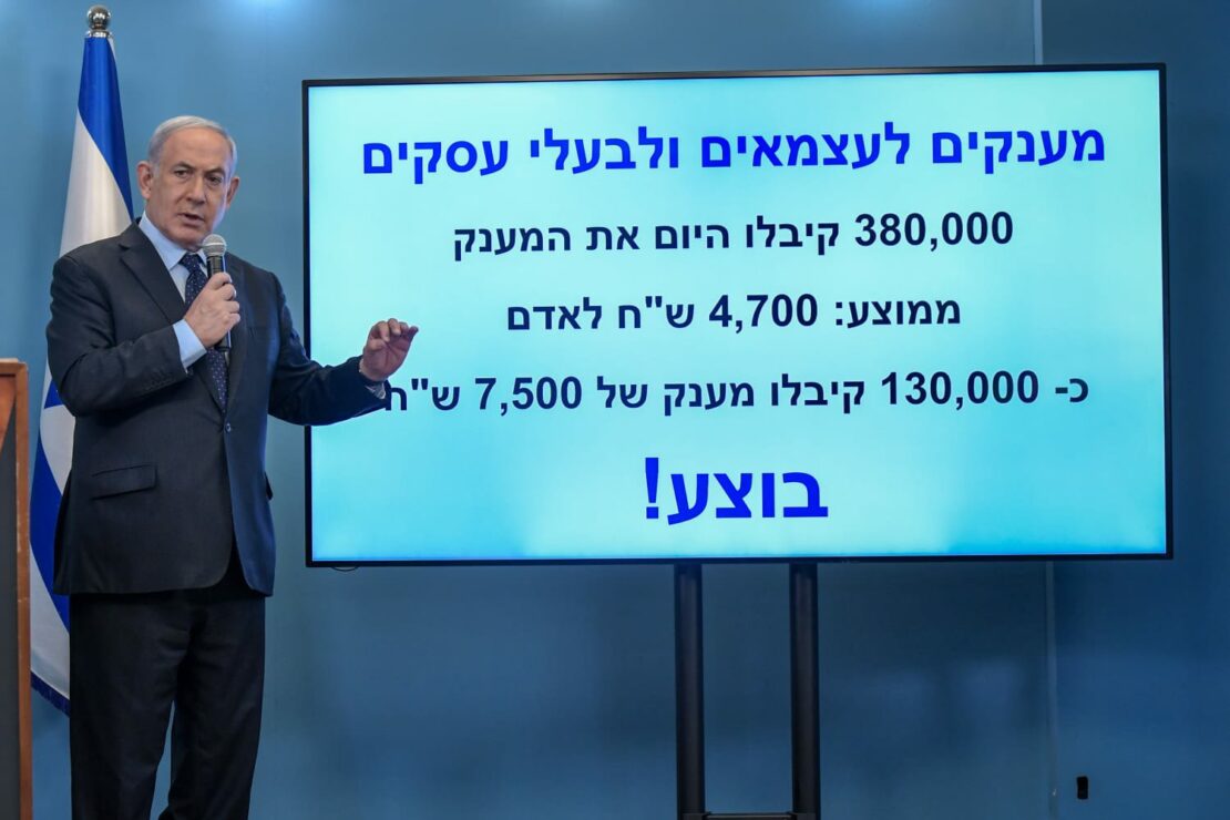כפי שאמרתי בתחילת השבוע, היום נכנס כסף לעצמאים ולבעלי עסקים. 380 אלף איש קיבלו היום את המענק. הממוצע הוא לא עשרות שקלים, הממוצע הוא 4,700 שקל לאדם. וכ-130 אלף איש קיבלו מענק של 7,500 ש"ח. הבטחנו, שר האוצר ואני, – וביצענו. זה הדבר הראשון.
