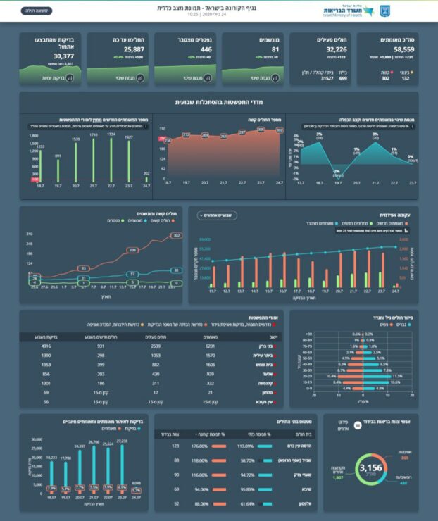 משרד הבריאות מעדכן כי מניין החולים המאומתים עד כה עומד על 58,559 (1,889 חולים חדשים ביממה האחרונה ו-231 חולים חדשים מחצות) מתוכם 32,226 חולים פעילים 31,792 במצב קל, 132 במצב בינוני, 302 במצב קשה שמתוכם 81 מונשמים (ירידה של 2 מונשמים מהלילה).