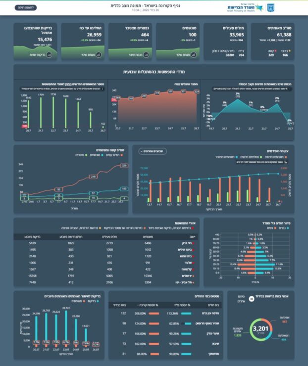 היום, 26.7 נכון לשעה זו מניין המאומתים עד כה עומד על 61,388 (1,108 חולים חדשים ביממה האחרונה ו-122 חולים חדשים מחצות) מתוכם 33,965 חולים פעילים 33,470 במצב קל, 166 במצב בינוני, 329 במצב קשה שמתוכם 100 מונשמים.