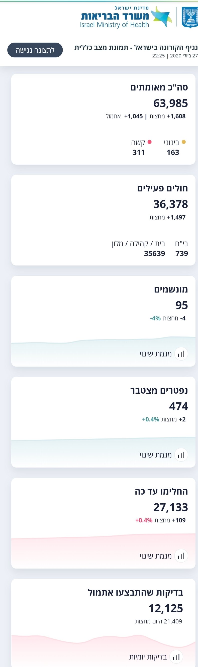 היום, 27.7 נכון לשעה זו מניין המאומתים עומד על 63,985 (1,045 חולים חדשים ביממה האחרונה ו-1,608 חולים חדשים מחצות) מתוכם 36,378 חולים פעילים 35,507 במצב קל, 163 במצב בינוני, 311 במצב קשה שמתוכם 95 מונשמים.