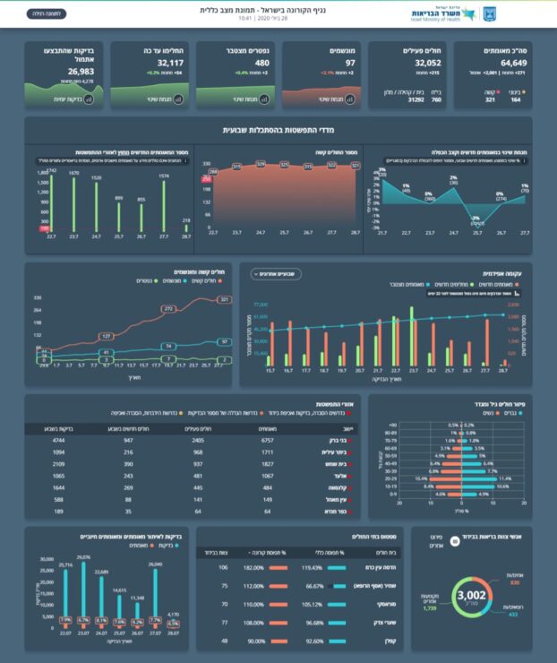 היום, 28.7 נכון לשעה זו מניין המאומתים עד כה עומד על 64,649 (2,001 חולים חדשים ביממה האחרונה ו-271 חולים חדשים מחצות) מתוכם 32,052 חולים פעילים 31,567 במצב קל, 164 במצב בינוני, 321 במצב קשה שמתוכם 97 מונשמים.