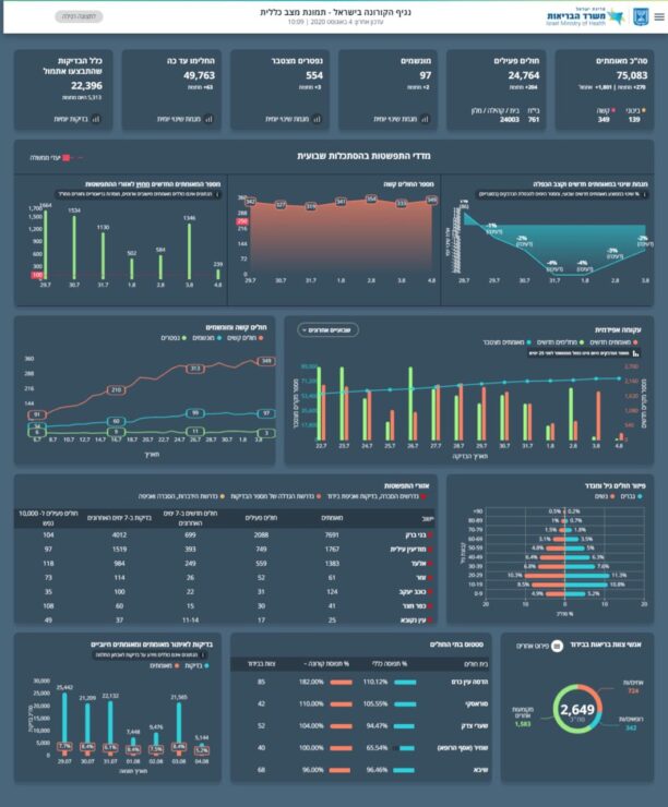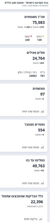 היום, 4.8 נכון לשעה זו מניין המאומתים עומד על 75,083 (1,801 חולים חדשים מאתמול ו-270 חולים חדשים מחצות), מתוכם 24,764 חולים פעילים, 24,276 במצב קל, 139 במצב בינוני, 349 במצב קשה שמתוכם 97 מונשמים.