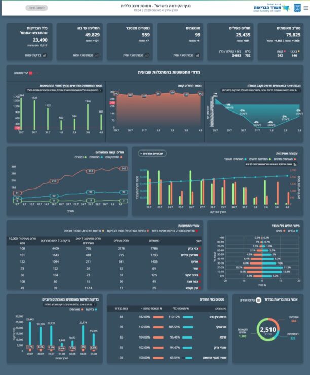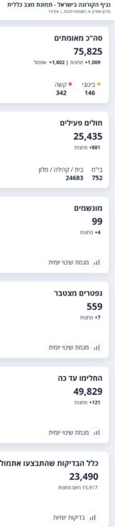 היום, 4.8 נכון לשעה זו מניין המאומתים עומד על 75,825 (1,802 חולים חדשים מאתמול ו-1,009 חולים חדשים מחצות), מתוכם 25,435 חולים פעילים, 24,947 במצב קל, 146 במצב בינוני 342 במצב קשה שמתוכם 99 מונשמים.