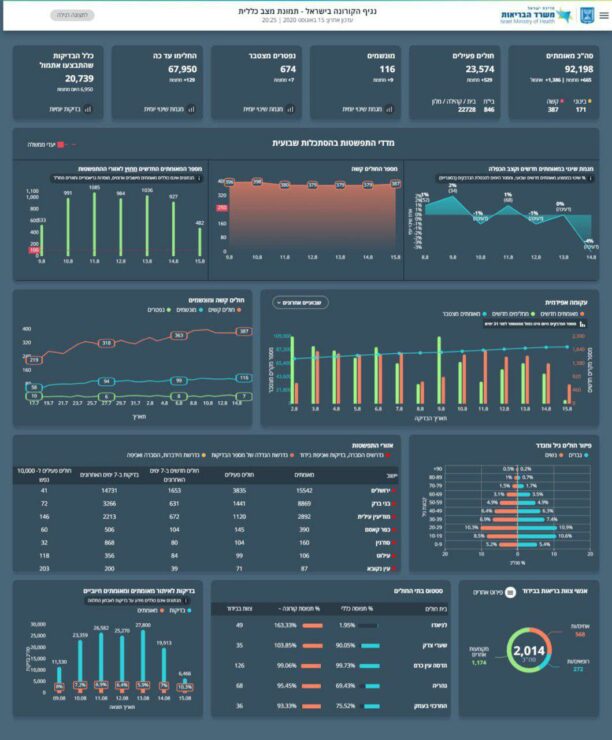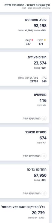 היום, 15.8 נכון לשעה זו מניין המאומתים עומד על 92,198 (1,386 חולים חדשים מאתמול ו-665 חולים חדשים מחצות) מתוכם 23,574 חולים פעילים, 23,016 במצב קל, 171 במצב בינוני, 387 במצב קשה שמתוכם 116 מונשמים.