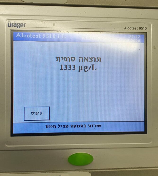 שוטר אגף התנועה שהגיע למקום, הבחין בנהג שסירב למסור פרטים כאשר מפיו עולה ריח חזק של אלכוהול. כאמור בבדיקת הנהג נמצא כי הוא בהשפעת אלכוהול בכמות 1333 מ"ג לליטר אוויר נשף (פי 5.5 מהמותר).