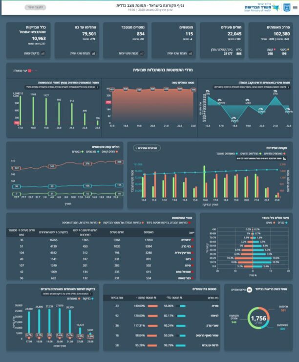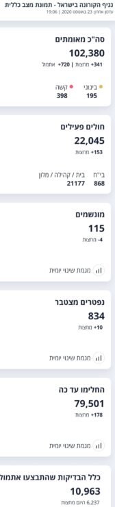 היום, 23.8 נכון לשעה זו מניין המאומתים עומד על 102,380 (720 חולים חדשים מאתמול ו-341 חולים חדשים מחצות), 22,045 חולים פעילים, 21,452 במצב קל, 195 במצב בינוני, 398 במצב קשה שמתוכם 115 מונשמים.
