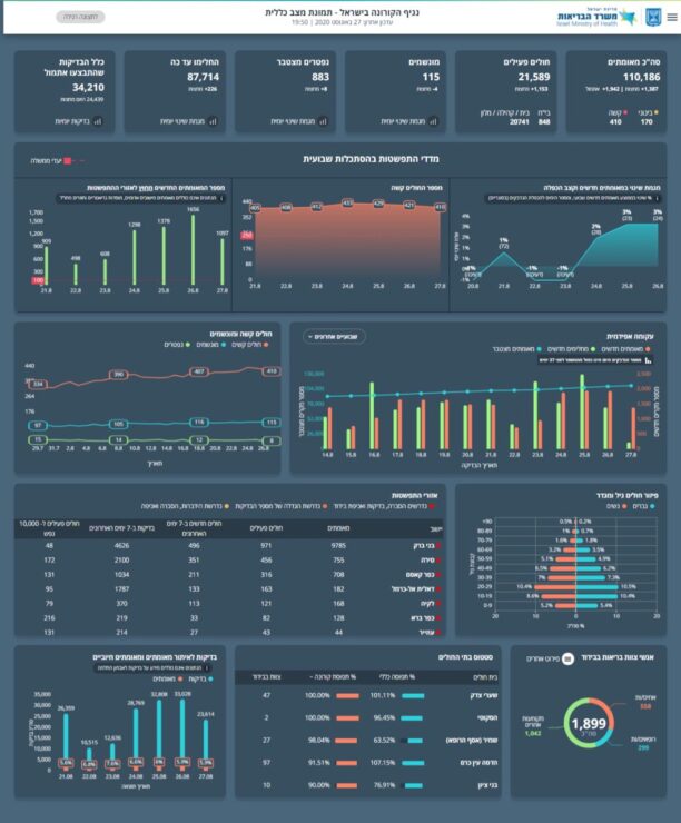היום, 27.8 נכון לשעה זו מניין המאומתים עומד על 110,186 (1,942 חולים חדשים מאתמול ו-1,387 חולים חדשים מחצות), 21,589 חולים פעילים 21,009 במצב קל, 170 במצב בינוני, 410 במצב קשה שמתוכם 115 מונשמים.