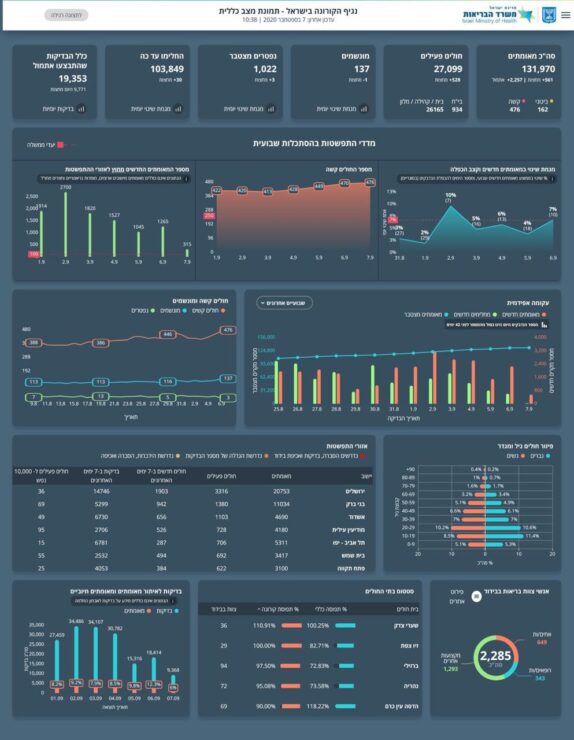 היום, 7.9 נכון לשעה זו: מניין המאומתים עומד על 131,970 (2,257 חולים חדשים מאתמול ו-561 חולים חדשים מחצות), 27,099 חולים פעילים, 26,461 במצב קל, 162 במצב בינוני, 476 במצב קשה שמתוכם 137 מונשמים.