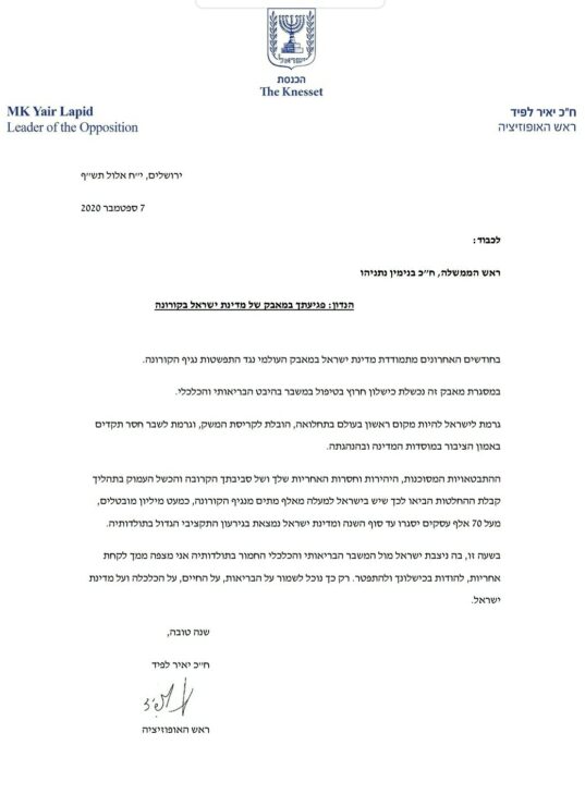 מכתב שהעביר ראש הממשלה נתניהו לראשי האופוזיציה יאיר לפיד, אביגדור ליברמן, נפתלי בנט ואיימן עודה.