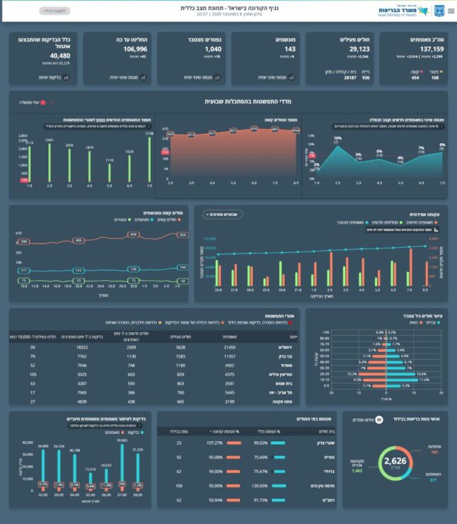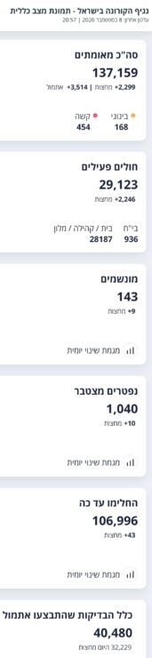 היום, 8.9 נכון לשעה זו: מנין המאומתים עומד על 137,159 ( 3,514 חולים חדשים מאתמול ו-2,299 חולים חדשים מחצות), 29,123 חולים פעילים, 28,501 במצב קל, 168 במצב בינוני, 454 במצב קשה שמתוכם 143 מונשמים.