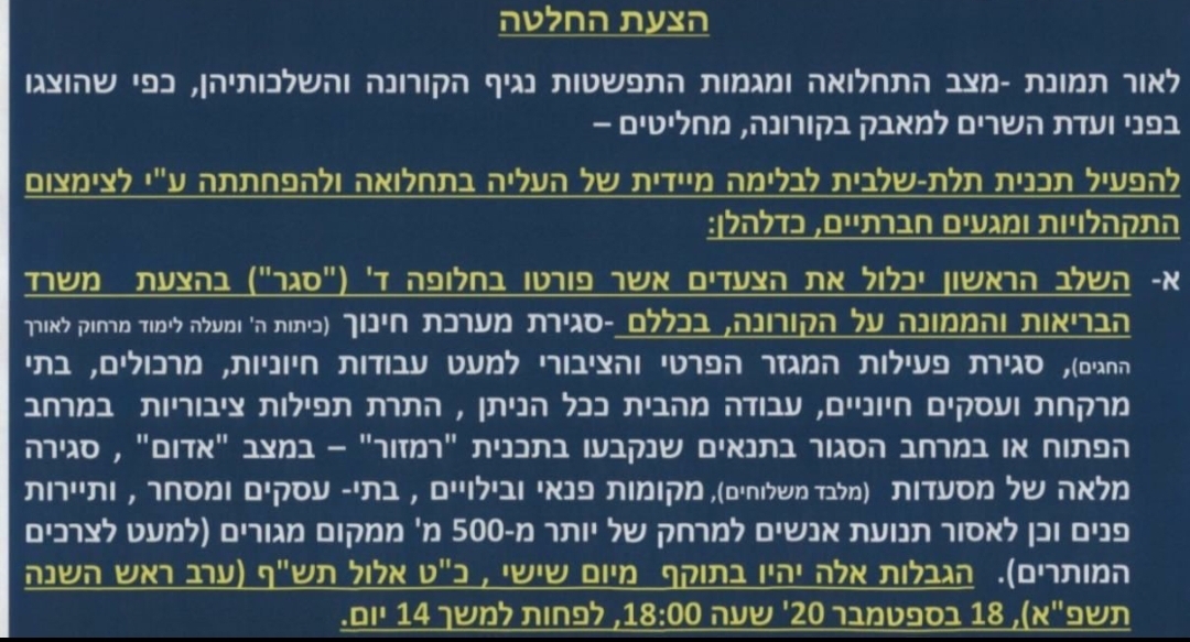 4. סגירת מערכת החינוך, למעט חינוך מיוחד, לאורך כל התקופה, מלבד למידה מרחוק לכיתות ה' ומעלה. חידוש הלימודים לאחר סוכות ייבחן בהערכת מצב מיוחדת.