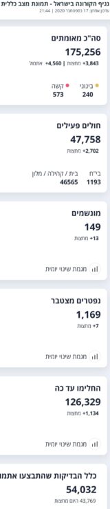 משרד הבריאות מעדכן כי 4,560 מאומתים חדשים אובחנו אתמול (16.9), מתוך 54,032 תוצאות בדיקות שהתקבלו.