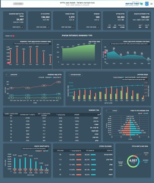 היום, 21.9 נכון לשעה זו: 1,653 חולים חדשים אובחנו מחצות. סך החולים הפעילים עומד על 52,263, מתוכם 279 במצב בינוני, 653 במצב קשה שמתוכם 169 מונשמים.