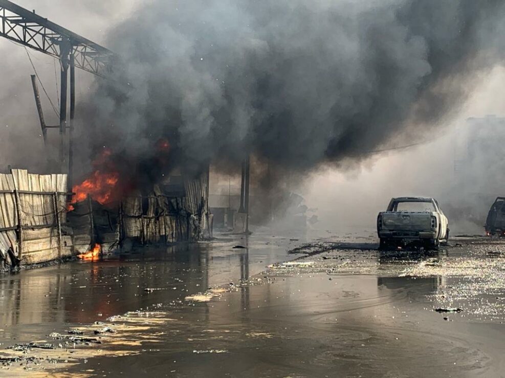 השריפה מתפשטת לכיוון משאיות ומבנים.