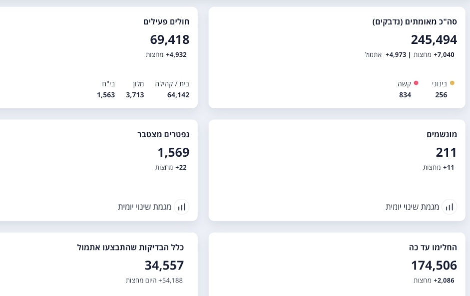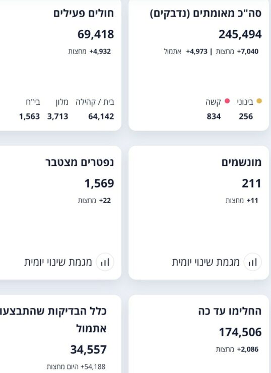 משרד הבריאות מעדכן על 7,040 חולים חדשים שנוספו מאז חצות, סך החולים הפעילים עומד על 69,418 מתוכם 256 במצב בינוני 834 במצב קשה שמתוכם 211 מונשמים והיתר במצב קל.