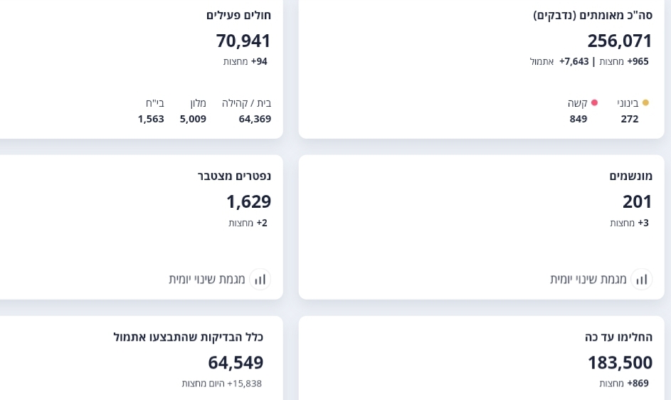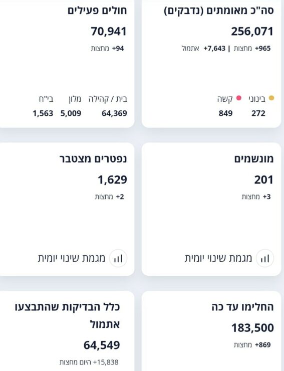 משרד הבריאות מעדכן על 7,643 חולים חדשים נוספו מאז אתמול ו-965 מחצות, סך החולים הפעילים עומד על 70,941 מתוכם 272 במצב בינוני 849 במצב קשה שמתוכם 201 מונשמים היתר במצב קל.