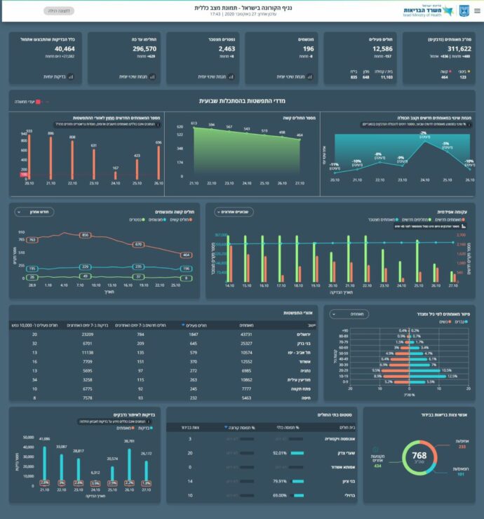 היום, 27.10 נכון לשעה זו: 480 חולים אובחנו מחצות, סך החולים הפעילים עומד על 12,586 נדבקים, מתוכם 123 במצב בינוני 464 במצב קשה שמתוכם 196 מונשמים.