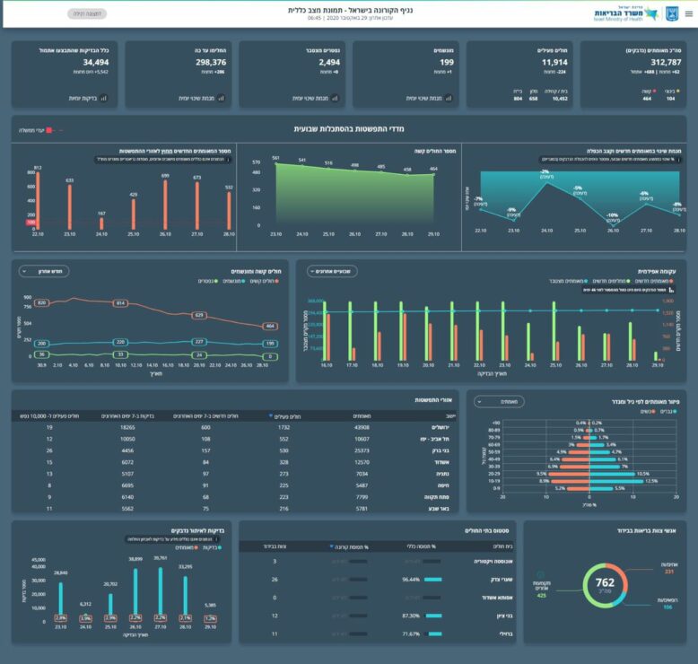 היום, 29.10 נכון לשעה זו: 62 חולים אובחנו מחצות, סך החולים הפעילים עומד על 11,914 נדבקים, מתוכם 104 במצב בינוני 464 במצב קשה שמתוכם 199 מונשמים, 2,494 נפטרו עד כה (0 נפטרים מחצות) מנין המאומתים מפרוץ המגיפה הוא 312,787 נדבקים, ו-298,376 החלימו עד כה, אחוז הבדיקות החיוביות עומד על 2.1%