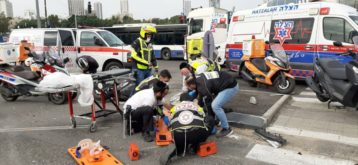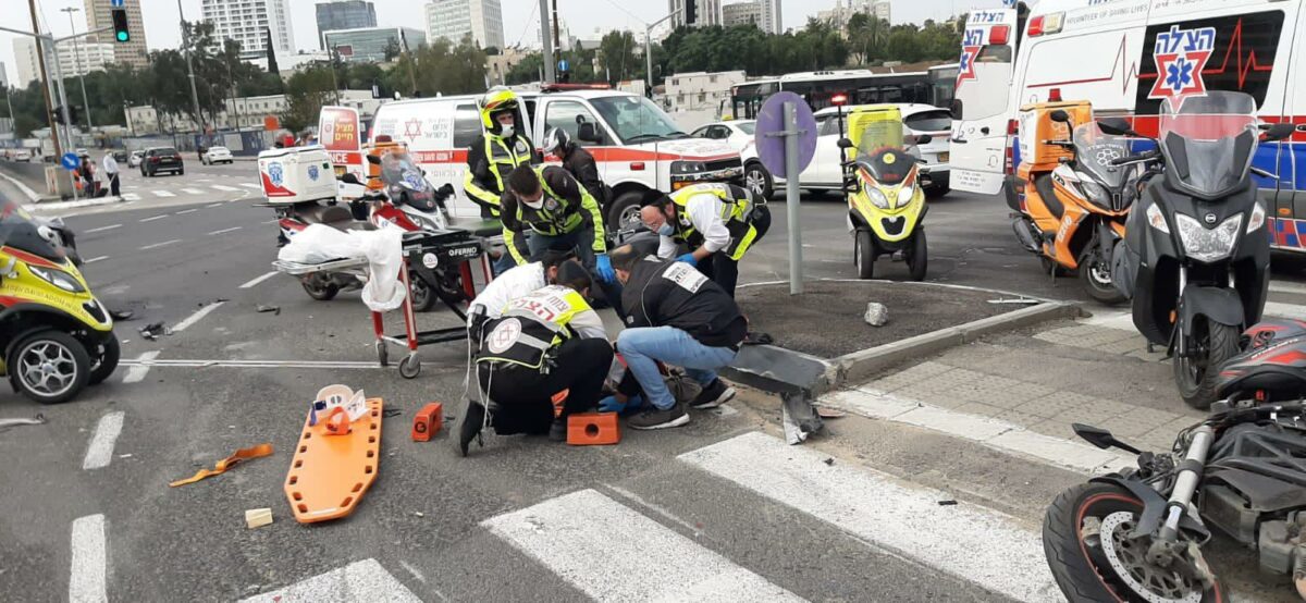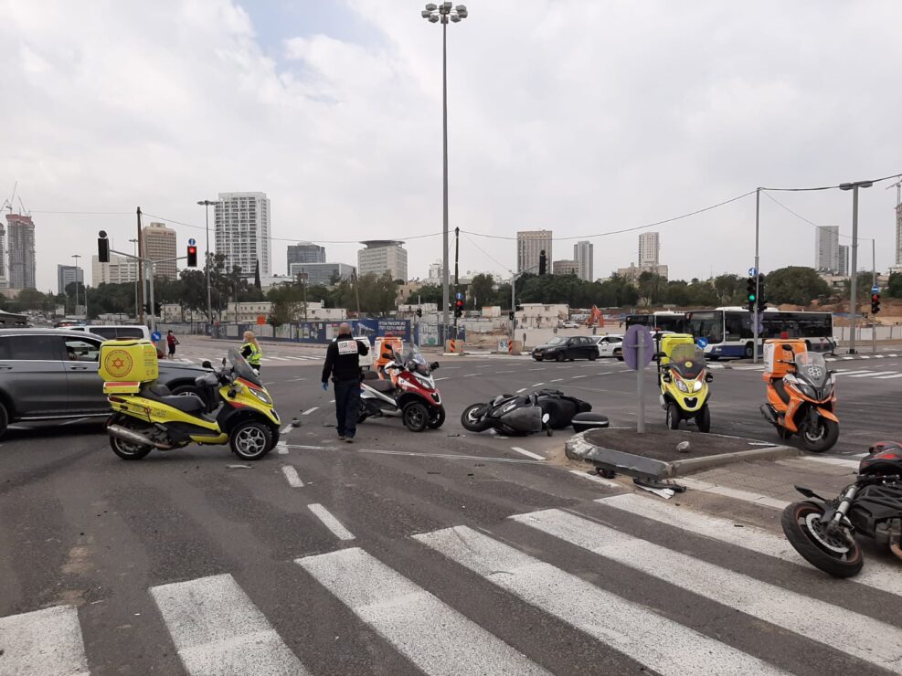 בשעה 10:53 התקבל דיווח על תאונה בין 2 אופנועים ורכב בצומת על פרשת דרכים בתל אביב. חובשים ופראמדיקים של מד"א ואיחוד הצלה העניקו טיפול רפואי ופינו לביה"ח איכילוב פצוע קל ואת 2 רוכבי האופנועים במצב בינוני: גבר בן 49 עם חבלות בגפיים תחתונות, וגבר בן 46 עם חבלה בבטן.