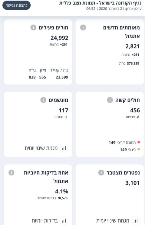 משרד הבריאות מעדכן על 2,821 מאומתים חדשים אתמול (20.12), מתוך 70,575 תוצאות בדיקות שהתקבלו – 4.1% מהנבדקים חיוביים.