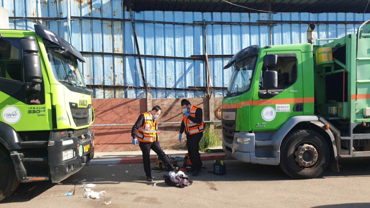צוותי רפואה העניקו סיוע ראשוני וביצעו החייאה על נהג משאית הולך רגל שנפצע אנוש מפגיעת משאית אחרת ברחוב אופיר בחיפה.