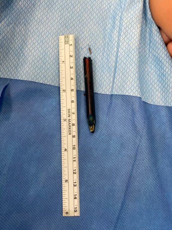 במשך חצי שנה הסתובב ש', בן 10 מאזור הצפון עם כאבים באזור העכוז, מבלי לדעת מה מקורם. לאחרונה הפכו הכאבים לבלתי נסבלים והוא הגיע לבירור ברמב"ם. מבדיקה שבצעו רופאי רמב"ם עלה ממצא מפתיע במיוחד – עיפרון שאורכו כ-7 ס"מ שהיה נעוץ בגופו.