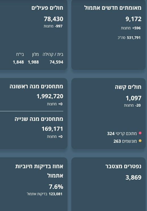 משרד הבריאות מעדכן על 9,172 חולי קורונה שאובחנו ביממה האחרונה, מתוך 123,081 תוצאות בדיקות שהתקבלו. – 7.6% מהנבדקים חיוביים.