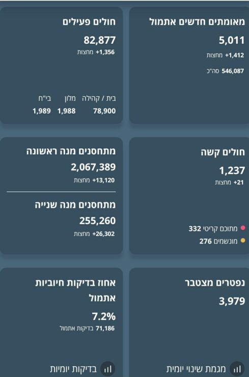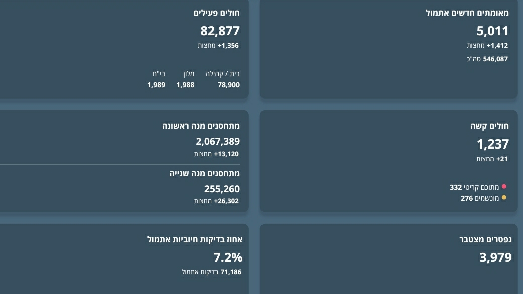עוד נמסר על שיא חדש, 1,237 חולים מאושפזים במצב קשה, מתוכם 332 במצב קריטי ו-276 מונשמים. מניין הנפטרים עומד על 3,979.