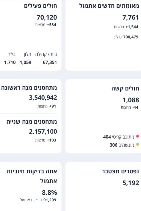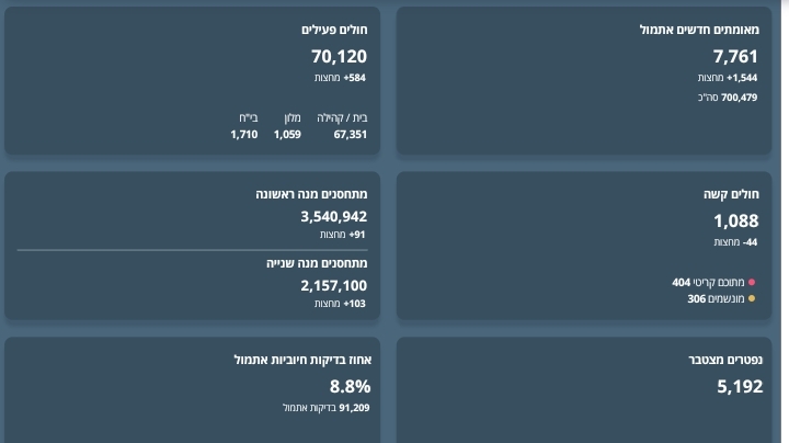 משרד הבריאות מעדכן על 7,761 חולי קורונה שנדבקו ביממה האחרונה מתוך 91,209 בדיקות – 8.8% מהנבדקים מאומתים.