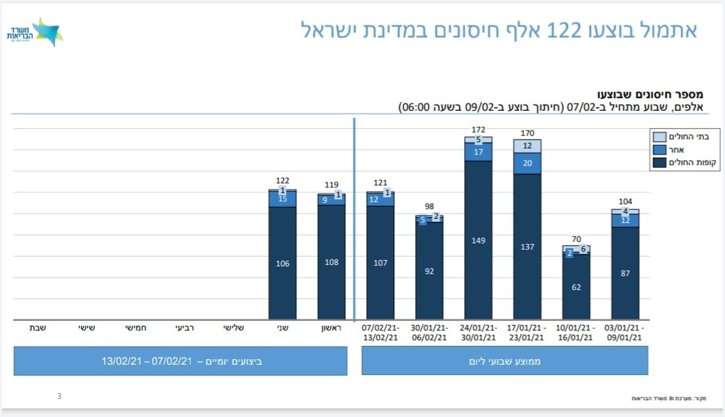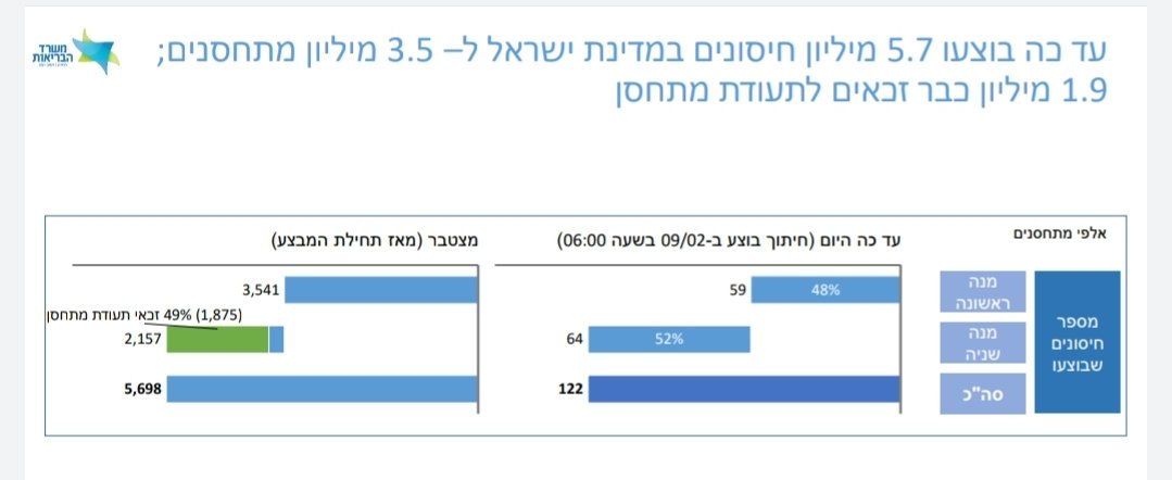 למעלה מ-3,500,000 מיליון איש התחסנו בישראל עד היום, מתוכם 2,157,000 קיבלו גם את החיסון השני. אתמול התחסנו 122,000.