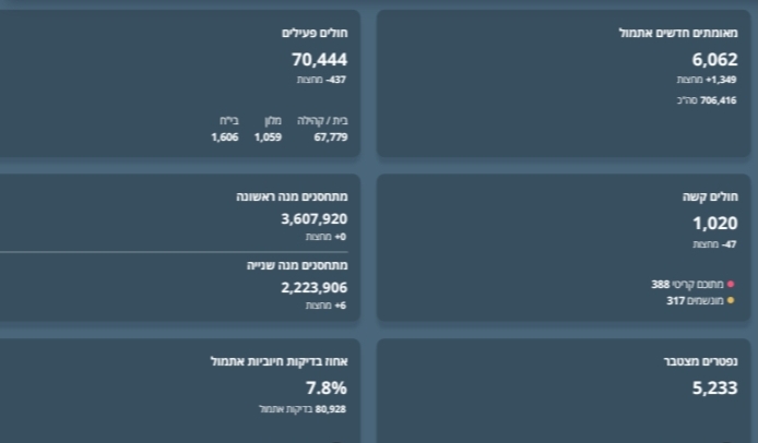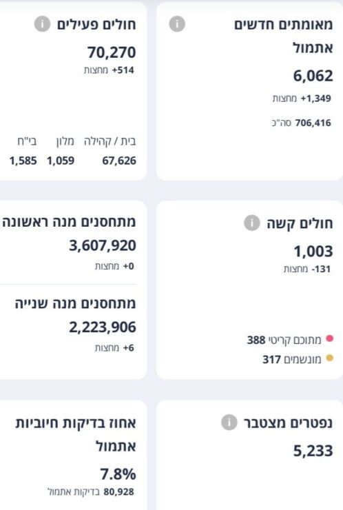 משרד הבריאות מעדכן על 6,062 חולי קורונה שאובחנו אתמול, מתוך 80,928 בדיקות – 7.8% מהנבדקים חיובים.