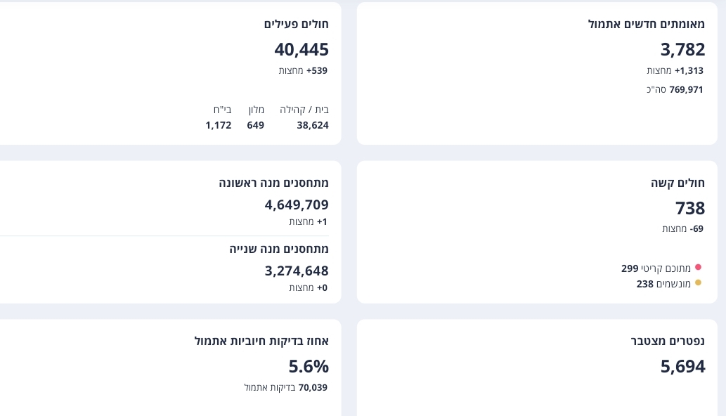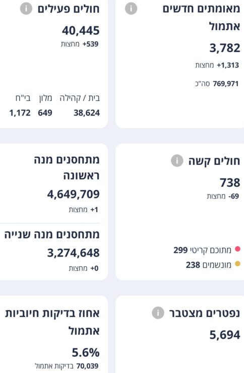 משרד הבריאות מעדכן על 3,782 מאומתים חדשים אתמול (25.2), מתוך 70,039 תוצאות בדיקות שהתקבלו.