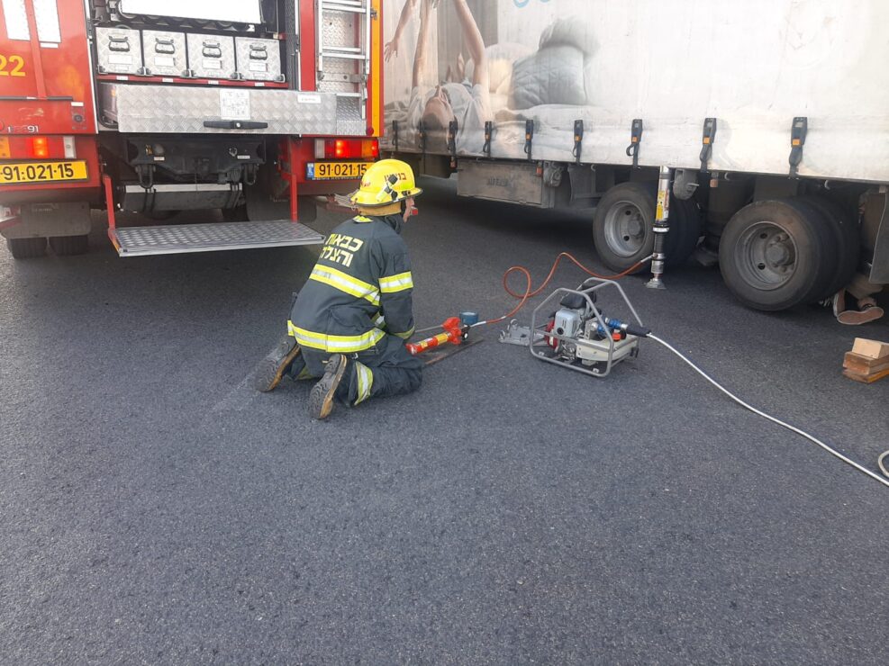 מדובר ברוכב אופנוע שנלכד מתחת לגלגלי המשאית. לוחמי האש השתמשו בציוד חילוץ הידראולי ופנאומטי ונעזרו במנוף שהיה במקום כדי להרים את המשאית ולחלץ את רוכב האופנוע, מדובר בחילוץ מורכב מאוד.