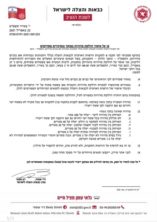 צו איסור הדלקת מדורות במועדים ובאזורים נתונים ברחבי הארץ בשל תנאים קיצוניים המעלים את הסבירות להיווצרות שריפות והתפשטותן תוך סיכון חיי אדם ורכוש.