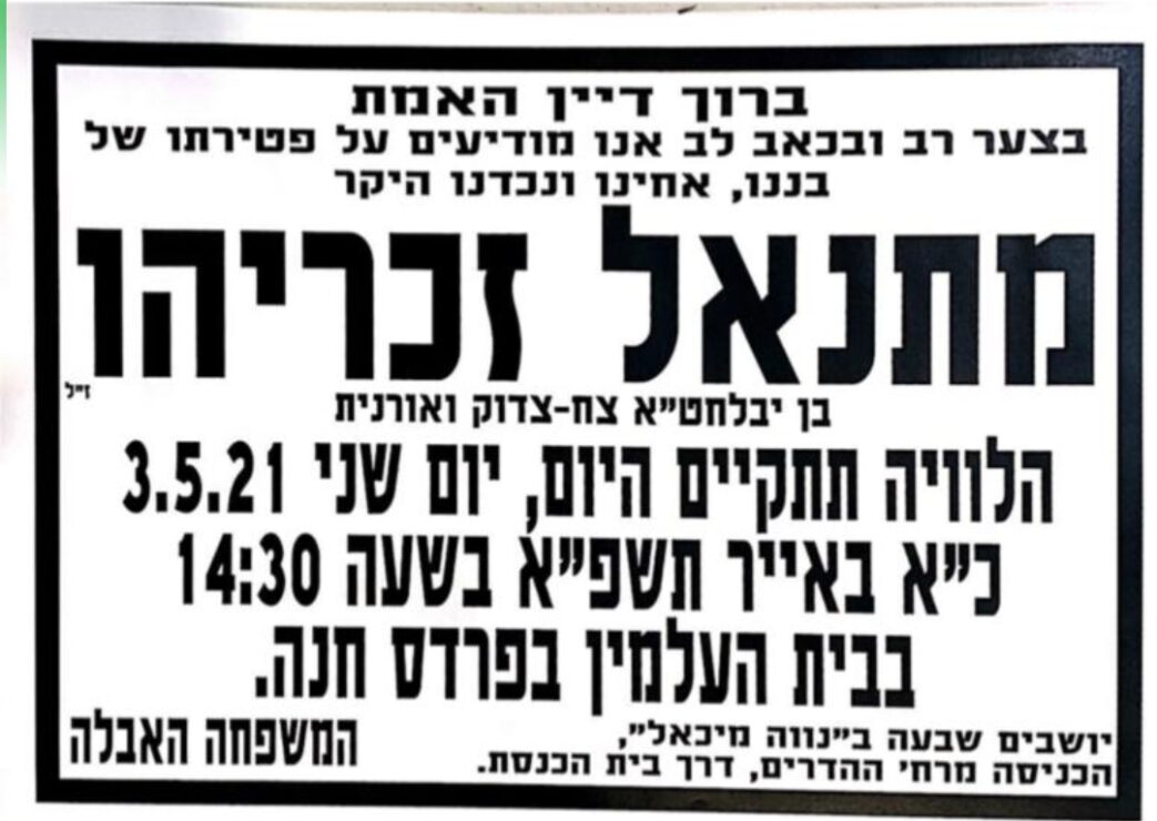 ההרוג בתאונה הוא מתנאל זכריהו תושב פרדס חנה. הלוויה תתקיים היום, יום שני כ"א באייר תשפ"א, בשעה 14:30 בבית העלמין בפרדס חנה.