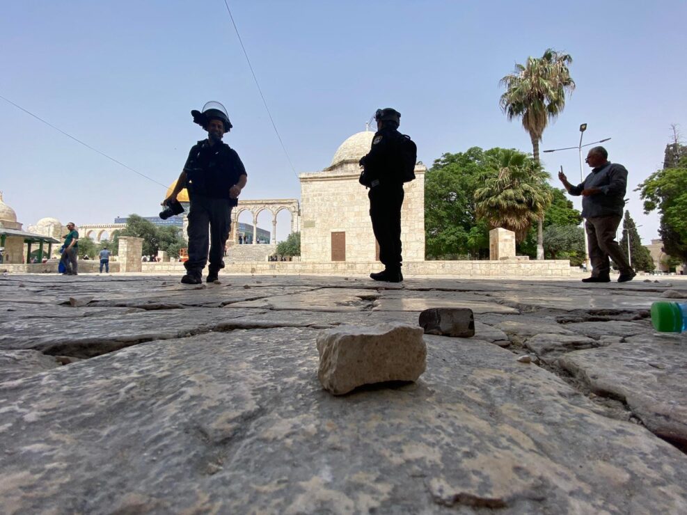 לפני זמן קצר, מיד עם סיום תפילת הצהריים, החלה התפרעות בהר הבית על ידי מאות צעירים שכללה יידוי מסיבי של אבנים, בקבוקי תבערה, קריאות לאומניות עם דגלי חמאס ותקיפת שוטרים שפעלו במקום.