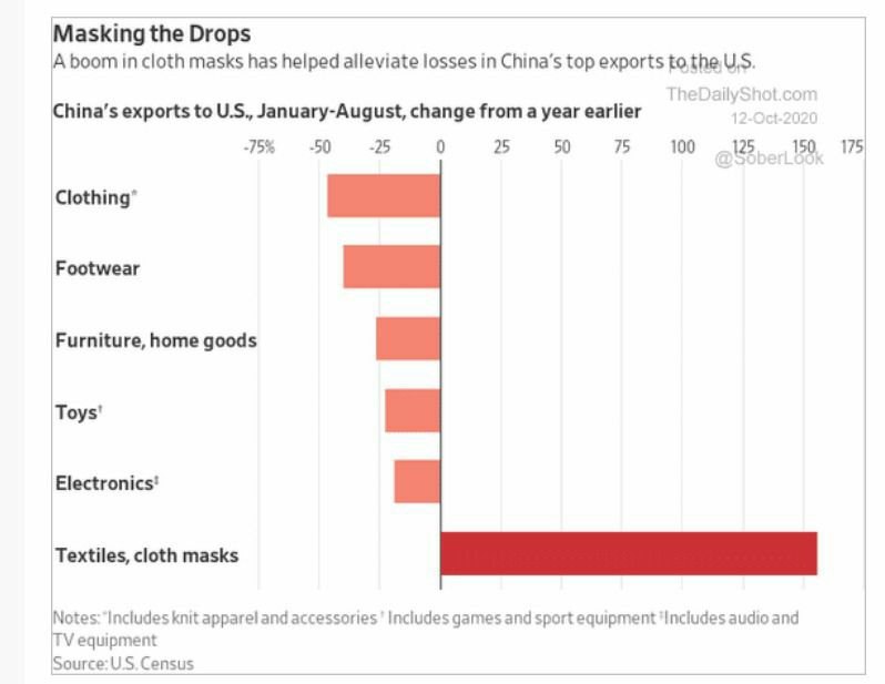 בגרף התחתון אנו רואים את הירידה ביבוא של מיגוון מוצרים מסין ואת העלייה של 150% במקביל ביבוא מסכות ומוצרי טקסטיל אחרים.